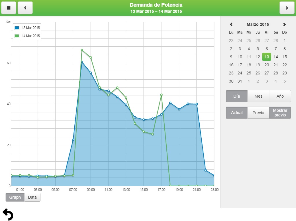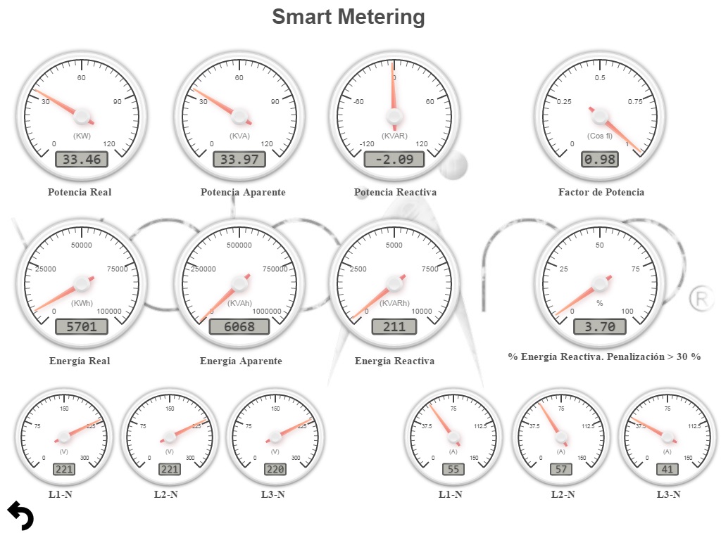Smart meetering en tiempo real, así como gráficas de potencia, energía y control del factor de potencia.